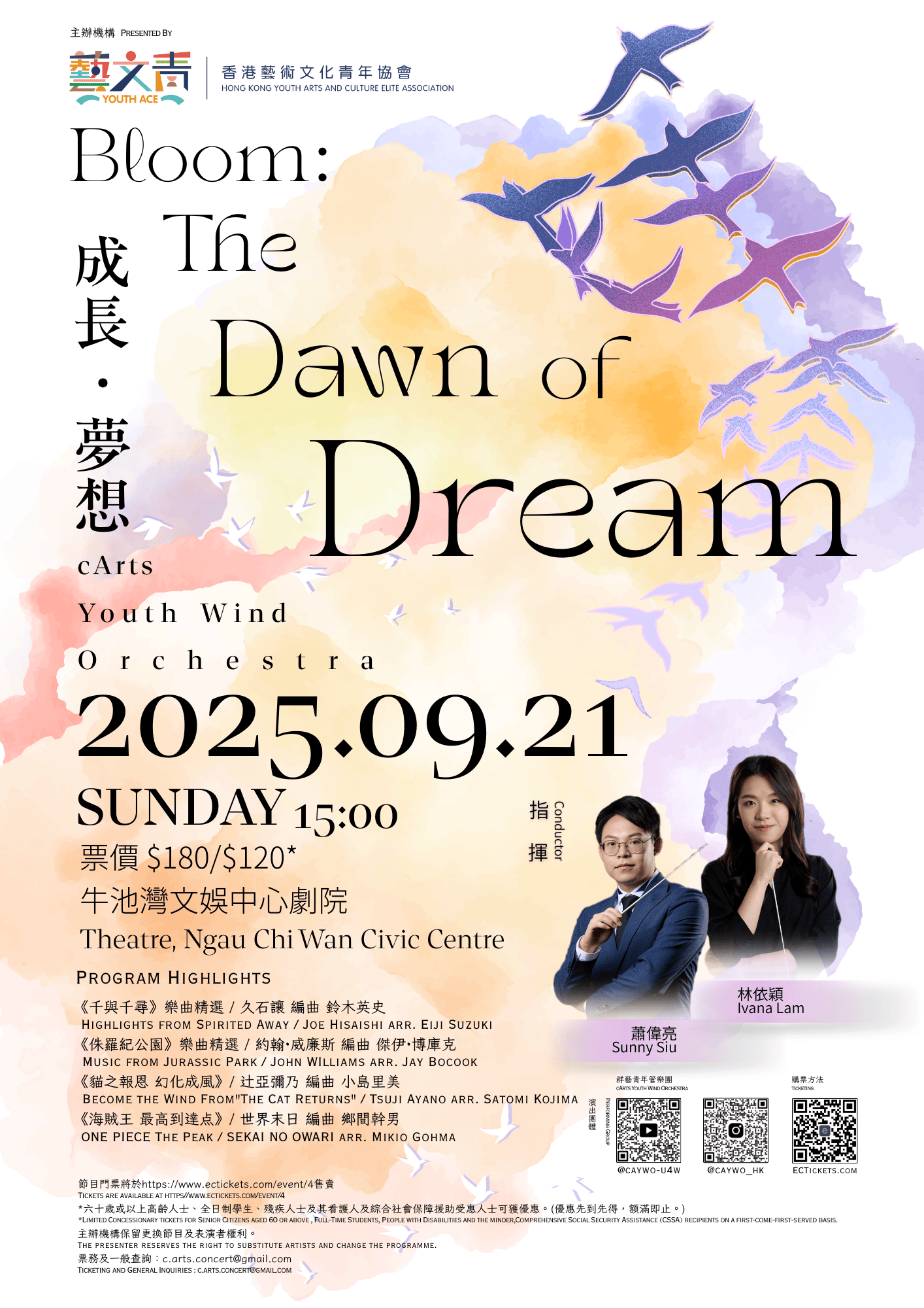 這個下午,群藝青年管樂團 CAYWO 邀請您一同探索成長與夢想的美好。每位成員都在音樂的旅程中不斷成長,透過音符傳遞出對未來的渴望與追求。 本次音樂會將展現一系列精心挑選的作品,從振奮人心的號角精神到觸動心靈的電影配樂,每一首曲目都是我們夢想與努力的結晶。透過音樂,我們希望能夠激勵每一位觀眾,勇敢追尋自己的夢想,並相信未來是無限可能的。 這場音樂會不僅是一次表演,更是一個分享成長故事的平台。我們期待與您一同見證青春的活力,感受夢想的力量,並在音樂中找到共鳴。讓我們攜手共創美好的樂章!